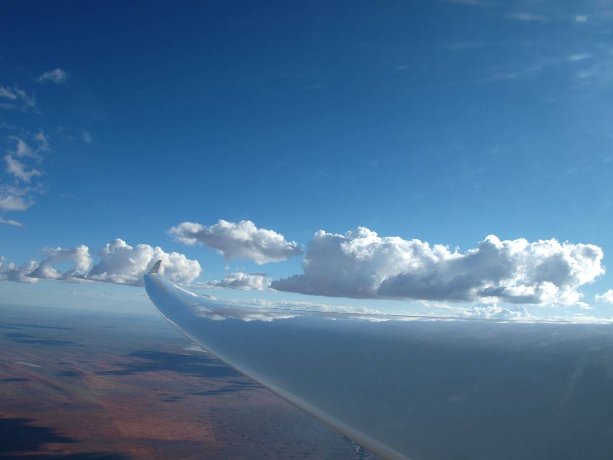 Der Wetterbericht verspricht heute PFD 900km. Zum ersten mal heißt es beim Briefing nicht „in X Tagen wird es aber gut“ 🙂 .Wir schreiben ein 758km FAI-Dreieck auf. Mit der Option das noch etwas auszudehnen, falls das Wetter noch besser ist. Unseren ersten Wendepunkt legen wir in den Nordwesten (Gollscha). Dort beginnt das Gebirge das die Namib-Wüste von der Kalahari trennt. Zur Küste hin fällt das Gelände deutlich ab – die Kalahari ein Hochplateau. Entlang dieses Gebirges legen wir unseren 2. Schenkel Richtung Helmring-Hausen, damit wir die Konvergenzlinie, die sich dort zwischen zwei Windfeldern häufig bildet, ausfliegen können. Wir kommen ganz gut voran, sind aber schon etwas langsamer, als auf dem ersten Schenkel. Der Flugplatz Helmring-Hausen liegt natürlich in einem großen blauen Loch (ist das nicht immer so?). Irgendwo bildet sich dann aber plötzlich doch was und wir sind noch ganz gut in der Zeit. Wir haben uns aber schon entschlossen, lieber das Dreieck zu Ende zu fliegen und dann eventuell noch etwas zu verlängern, als dass wir später abbrechen müssen.